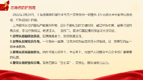 本支部成员王娟同志为大家讲解了上海市委组织部向全市共产党员发出一封题为《在大战大考中彰显特殊责任、特殊担当》的信的内容要点,并以此信展开对奥密克戎病毒知识的科普以及志愿者防护指南的讲解,最后呼吁大家做好防护,听从指挥,科学防疫。