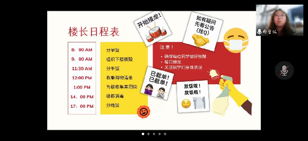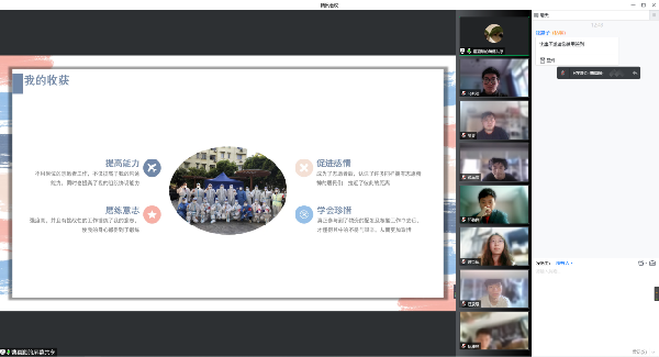 郑雪仪同学分享了自己做校内志愿者的经历和感受。在这个特殊时期,郑雪仪担当起了学院志愿者统筹管理的“大管家”,与其他很多党员同志一起在一线行动,共克时艰。他们不计个人得失,穿上“大白”忙于核酸检测组织工作,为同学们分发物资和餐食,开展消毒消杀工作,了解同学心声、消除焦虑情绪,积极传播正能量,而一天下来自己却很少能有休息的时间。听到同学们在微信群里发的一句“辛苦了”,会感到非常欣慰和充满信心,相信我们一定能够战胜疫情。