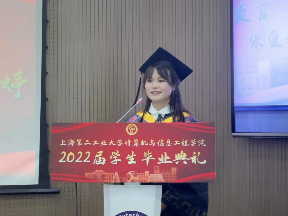 2018级智能科学与技术专业的张爱婷同学作为优秀毕业生代表发言,她向学院领导和老师们的培养表示感谢,并表示将在未来的人生道路上始终牢记二工大“厚生、厚德、厚技”的校训,做拥有智慧并富有激情的人,做胸怀大智并脚踏实地的人,做富有责任并敢于勇挑重担的人,不畏艰险、追求卓越,以星火之名燃青春之光。