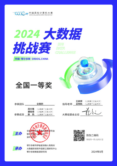 8月26日,由我院数据科学与大数据技术专业教师王家辉、孟宪凯指导,学生周文骞(22数据A1)、潘瑞珺(22数据A1)、陈凯(22智能A1)组成的团队,从386所高校1777支队伍中脱颖而出,荣获2024中国高校计算机大赛——大数据挑战赛总决赛第5名、全国一等奖的好成绩。