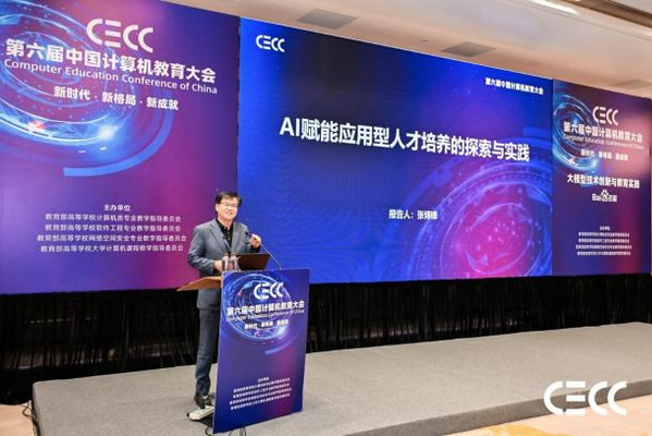 本届大会以“新时代·新格局·新成就”为主题,来自全国计算机学术界、教育界和产业界的100多位领导和专家,以及3000多位高校教师和产业代表齐聚一堂,共同探讨新时代计算机教育的发展方向。yl6809永利官网院长张博锋受邀出席,并在大模型技术创新与教育实践大会论坛中发表题为“AI赋能应用型人才培养的探索与实践”的主旨报告。