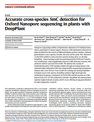 Prof. Liu Zhendong from the School of Computer and Information Engineering, in collaboration with Prof. Xiao Chuanle’s team at the State Key Laboratory of Ophthalmology, Sun Yat-sen University, has published a paper titled Accurate cross-species 5mC detection for Oxford Nanopore sequencing in plants with DeepPlant in the prestigious journal Nature Communications (a Chinese Academy of Sciences (CAS) Top journal, with an Impact Factor of 14.7 in 2024). This marks the first time our institute has achieved such a milestone in publishing in a top-tier Nature journal.